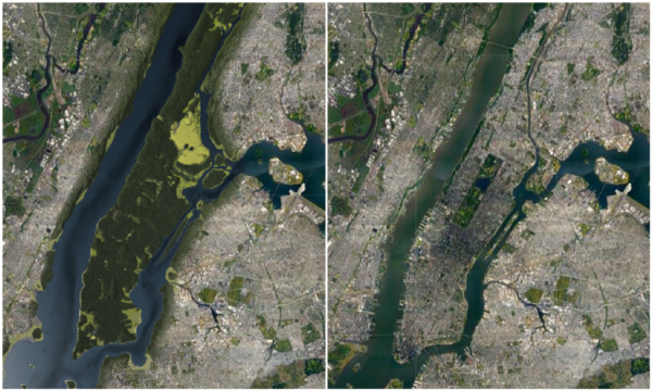 そのマンハッタンの400年前、ヨーロッパ人が足を踏み入れる前の状態を再現した地図と現在の地図とを比較できるサイトが本書で紹介されていて、その2つを並べたのが下の画像である。