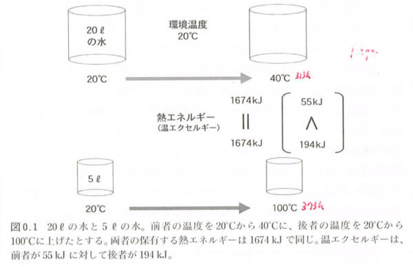 例えばこの図。20℃ 20Lの水を40度に温めたものと、20℃ 5Lの水を100度に温めたものでは資源性が異なる、と言われてピンと来るだろうか。