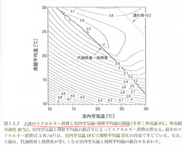 例えば、「体感温度≒(室温+周壁の表面温度)÷2」みたいなことが言われたりするけれども、もっと厳密に、室温と周壁の表面温度その他の条件によって、人体が消費するエクセルギー、言い換えると人体に対する負荷/心地よさがどう変化するか、といったことを根拠をもって理解することができる。