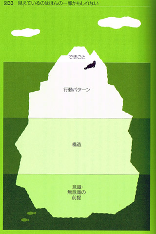 上の図で言えば、多くの人は出来事やそこに見える行動パターンをもとに判断をすることが多いが、その裏に潜む構造・システムやさらにその裏にある無意識や前提のようなものこそが変革には重要となる。