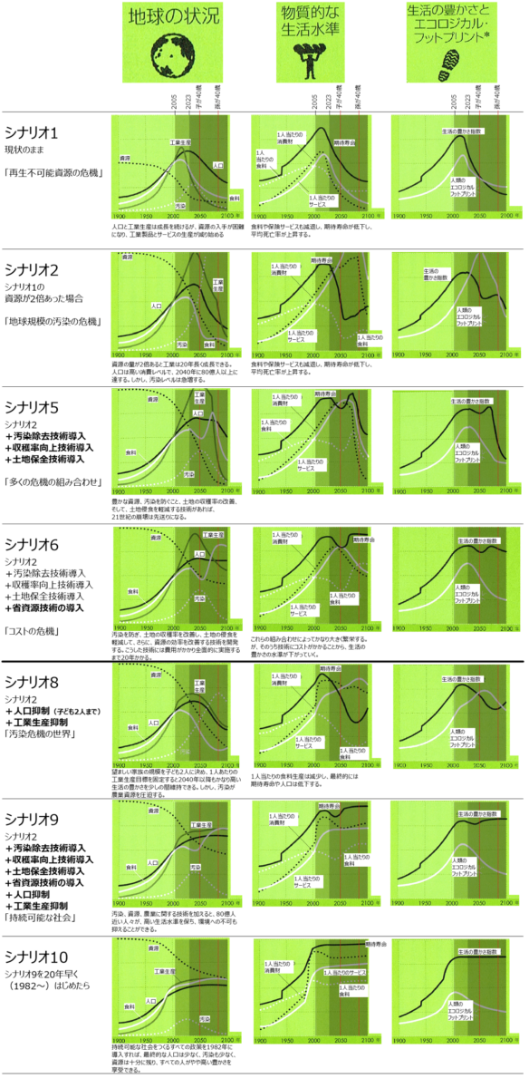 例えば、汚染除去や農業関連の技術が導入されるが、省資源化や人口抑制、工業生産抑制を行わなかった場合のシナリオ5では、孫が大人になる頃には環境は崩壊をはじめてしまう。