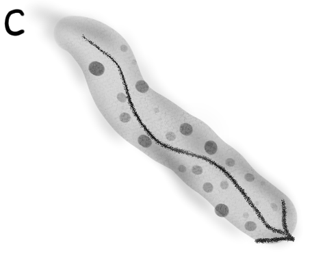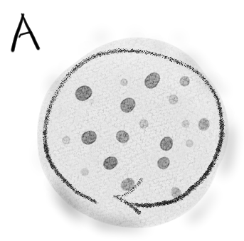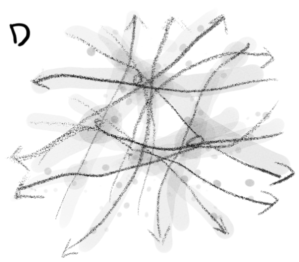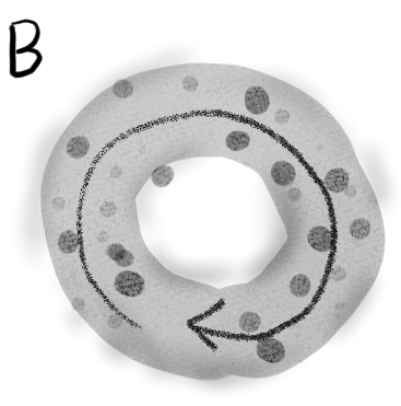 B. しかし、Aでは境界が明確なため、内と外という構造的な印象が強すぎるかもしれない。それよりは、はたらきの周りに要素が絡み合って、一時的にはたらきがまとまりを生み出しているというイメージの方が適切だろう。オートポイエーシスはシステムであって、構造ではないし、内側を他者が通り抜けながらその時時に構造が生成し続けるイメージはトポロジー的にも良さそうだ。