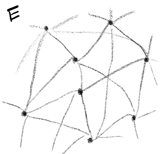 E. 一方、メッシュワーク的な世界観と比較されている、ネットワーク的な世界観では、線は点と点を結ぶもの、すなわち関係性・構造を示すものであり、はたらきを示すものではない。ここでは、結ばれる点はそれぞれ独立した”対象”、境界に囲われた存在として描かれる。本書には、アリ(ANT:Actor-Network-Theory を想起させる)とスパイダー(網:インゴルド自身を想起させる)の寓話が載っているけれども、アクターネットワーク理論オブジェクト指向存在論に感じた、静止した印象はアクターやオブジェクトが境界づけられた”対象”として捉えられていることによるものなのかもしれない。(といっても、この印象には誤解が含まれているであろうことも承知している)
