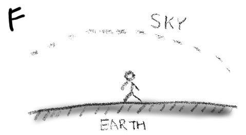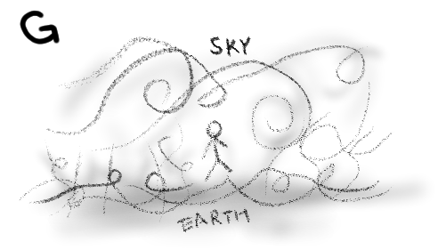 F. 多くの人にとって、大地は自分たちを支える、固まった台のようなもの、単なる固形物で、天空は私たちの上部を覆う空虚なもの、というイメージだろう。そこでは、人は大地や天空と切り分けられた存在であり、大地や天空は、その”対象”としての存在を支える背景でしかない。