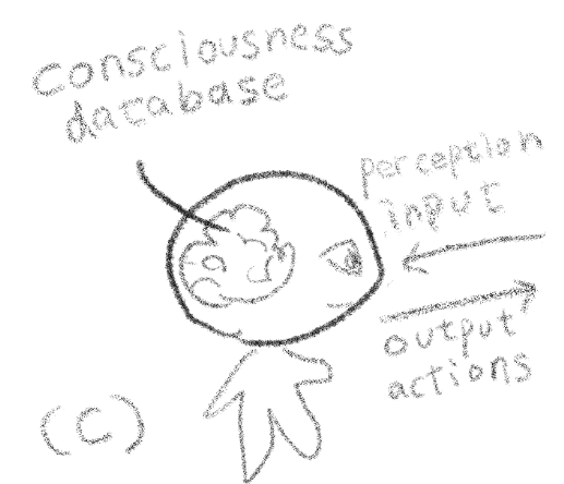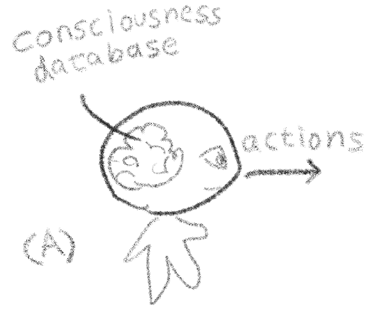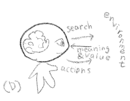行為を選択するための基準となる蓄積と、行為を選択する意識としての脳があり、それによって能動的に行為が行われるイメージ。