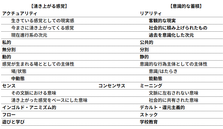 前者は、あくまで人の意識的な営みにフォーカスしていますが、後者は、環境との関係性と現在性に焦点があります。