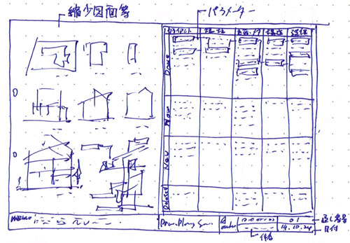 A3用紙の左側に縮小図面やスケッチ・パース等を進捗に合わせてレイアウトし、右側にプロセスに関わるパラメータを記述する。