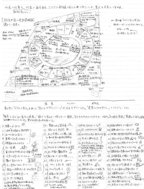 上の図には「◯◯で育つ」という状況が建物内に限らず敷地いっぱいにみっちりと書き込まれていますし、下に抜き出したアイデアも60に達しました。