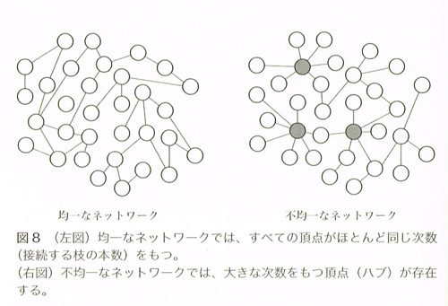 また、後者に関しては、行き当たりばったりの設計態度が考えられる。次々と現れる条件に成り行きで対応していっても、何らかのネットワーク状のかたちを生むかも知れないが、それはランダム・グラフのような均一なもの(フリースケール性を持たない)である可能性が高く、そこに不均一なネットワークが持つような複雑な秩序は生まれがたい。ハブを生成するプロセスが欠かせないのだ。