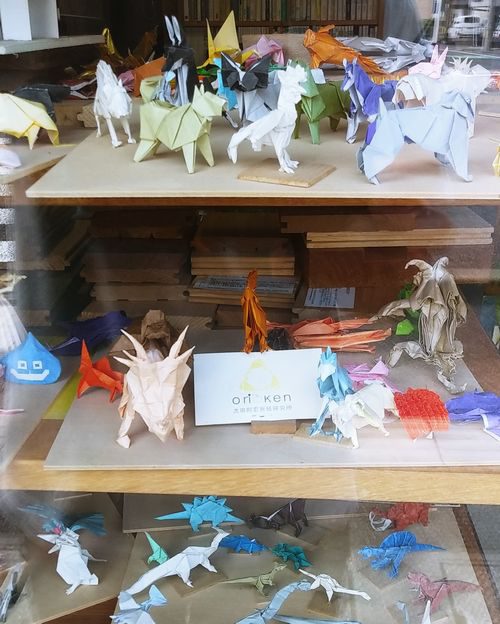 通り沿いには棚を置いていて、昔は模型をずらっと並べてたんだけど、折り紙たちにとって変わられた。よく通りがかりの子どもたちが見ている。