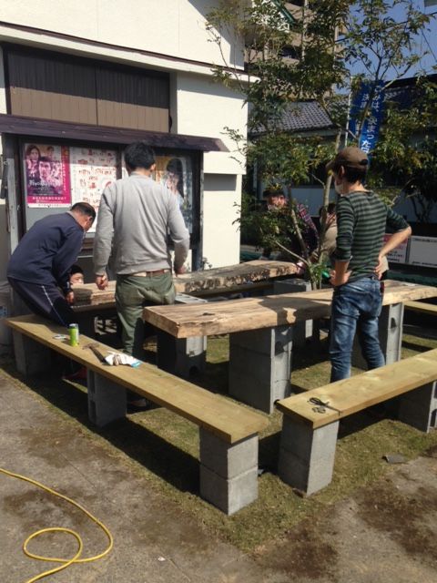 公民館が通りから閉じた印象だったので、DIYで浮かせたお金で、植栽とベンチづくりDIYでなるべくオープンな表情に。