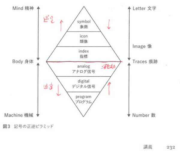 重要なのはそれぞれのピラミッドの底辺が接している、ということで、この部分に身体的に感応し、情動のもととなるような、素材・データベースがあり、それらが社会的にネットワークをなすことで個人的・集団的な無意識の源泉ともなっている。