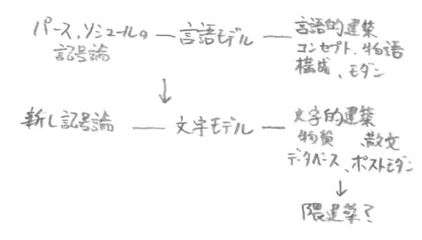 「言語モデルから文字へ」「人間との言語的なコミュニケーションから、人間と機械とを交えた文字的コミュニケーションへ」「光学モデルからネットワークモデルへ」「「状態」から「働き」へ」といったことを考えた時に、頭に浮かんだのは隈研吾による建築でした。