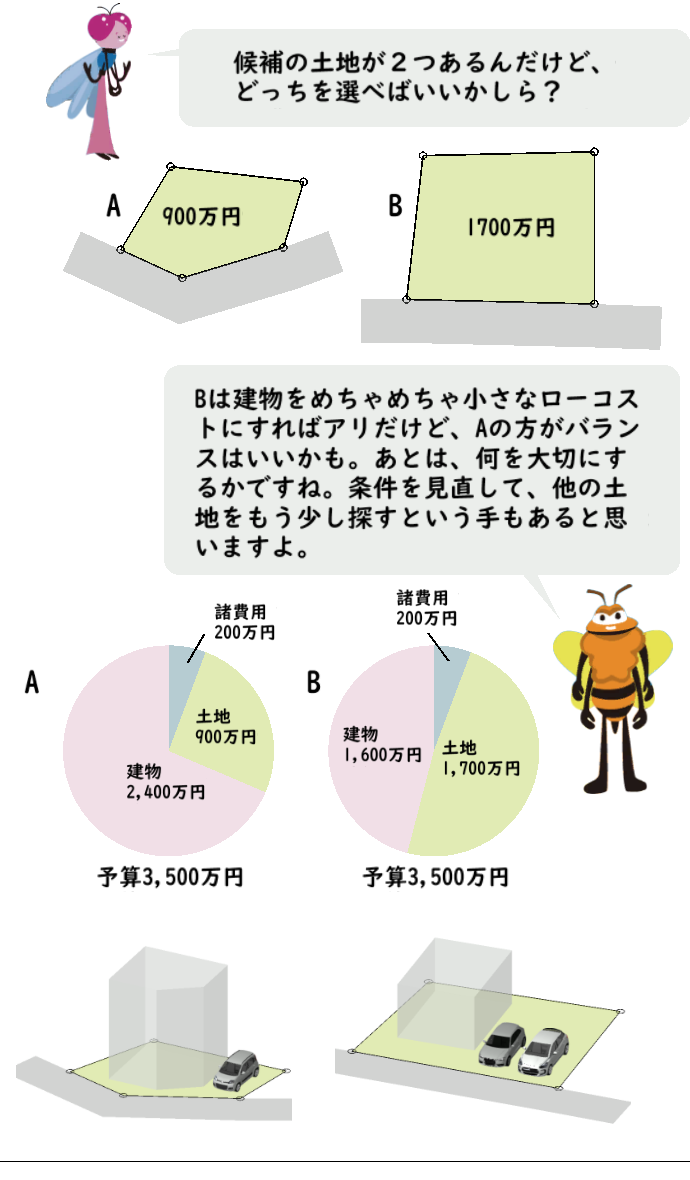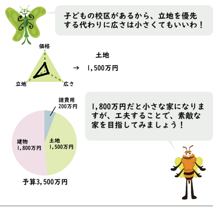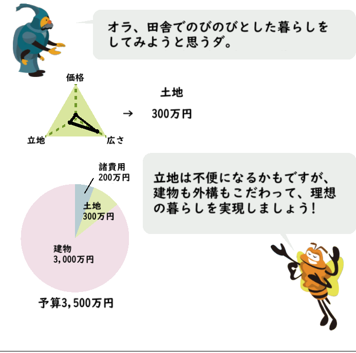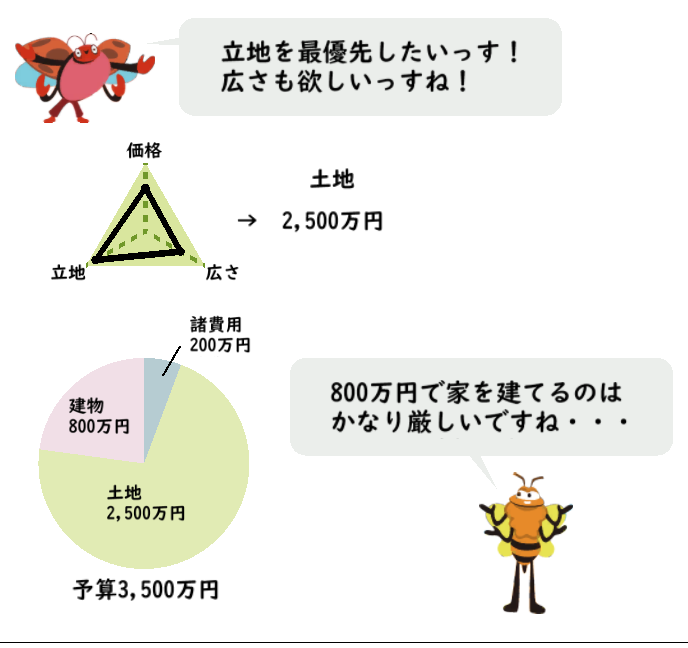 ・その予算を土地と建物にどう割り振るか?土地は立地と広さのどちらを優先するか?のイメージを持つ。