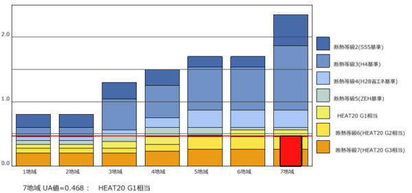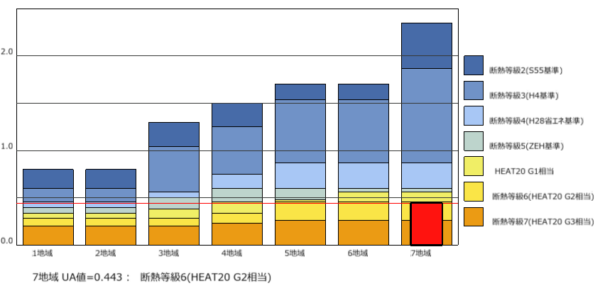 上図はUA値0.443 HEAT20 G2相当の場合です。主空間の暖冷房負荷のピークはそれぞれ4.4kW、2.6kW程度。年間暖房負荷が7013kWh、年間冷房負荷が4980kWhとなりました。この負荷の差分と断熱費用の差額、住人の生活スタイルを考慮することで、どちらを採用するかを検討することが可能となります。(思ったより年間の負荷は減っていません。効果をあげるにはもっと思い切った断熱強化が必要になるかと思います。今回は今のところHEAT20 G1相当の仕様を採用しています。)