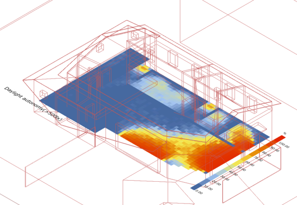 この図は、DA値(Daylight Autonomy 年間を通して有人時間内で設計照度以上となる時間の割合)を表示したもので、自然光のみで500lx以上となる時間の割合を示したものです。