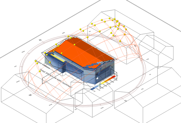 ここで重要なのは、壁面、特に開口部において、夏は日射量が少なく、冬は日射量が多くなるように方位や庇の形状などを考えることです。当然、周囲の建物などの影響も考慮する必要があります。