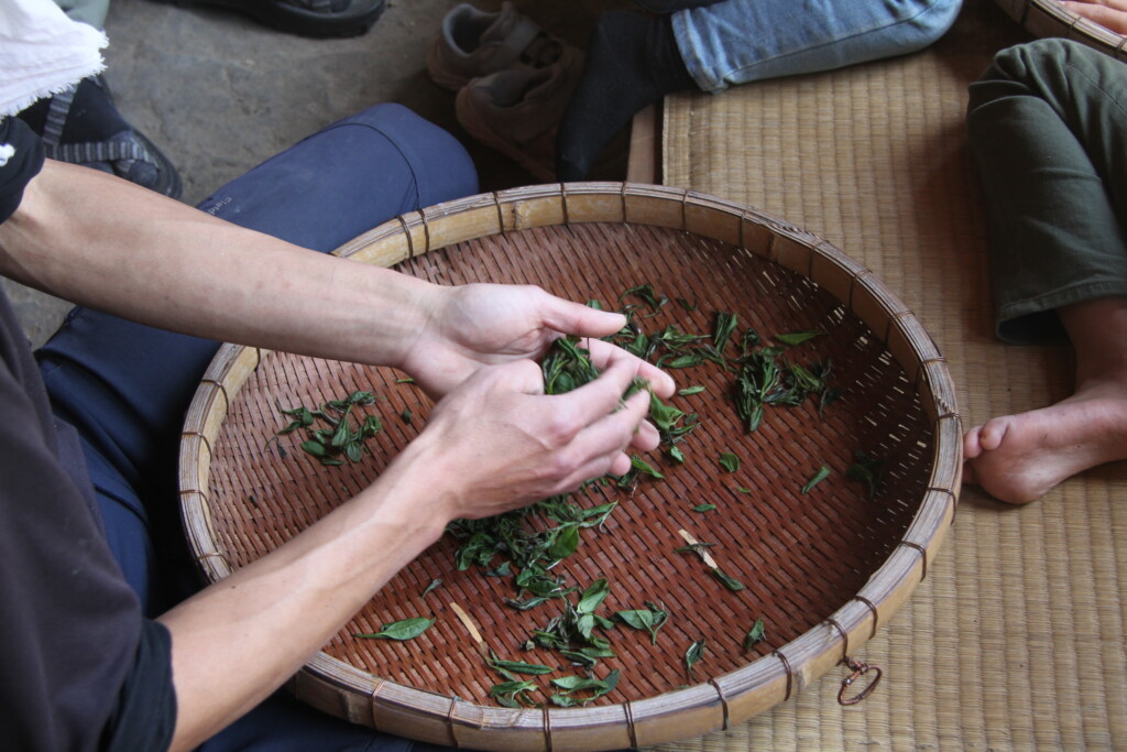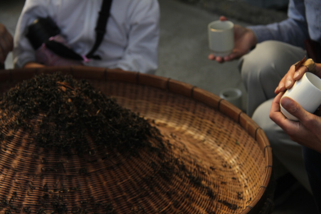 この作業が化学的には茶葉にどういう効能を与えるのか、といった議論が飛び交う中、チャベロを丸く囲んで、お湯を入れた湯呑みでツマミ飲み。(ツマミ飲みの文化は中国にあるそうで、楽しそうなので採用)