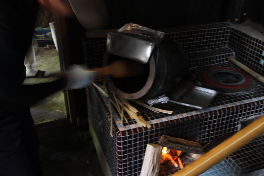 午後からは、まず竈門で午前中に摘んだ茶葉を軽く炒るところから。
