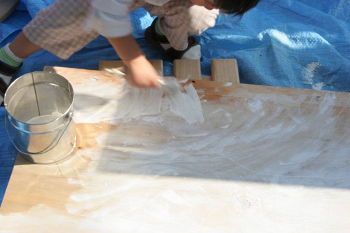 週末に家で作業をするとなると、作業と子供の相手をいかに両立させるかというのがポイントになってくるのですが(ほんとに?)、今日はペンキ塗りをさせることに。