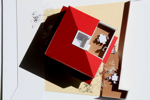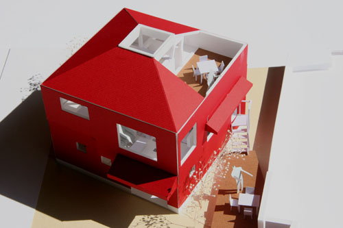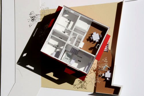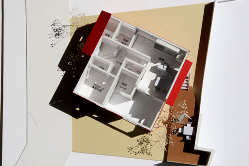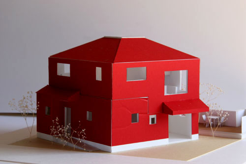 YOSHINONGE.Hの第1案模型(1/50) 今、少し面積を増やした第2案を検討中です。 30坪程度の住宅で、ローコスト化をはかりながらどうすれば、空間の質を確保できるか。 高さ関係の寸法の見極めと素材の扱いがキーになりそうです。 最後はコストとの戦いになりそうな予感。