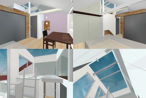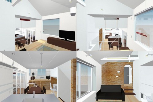 図面もとりあえず一通り書いたので、確認のため内部パースを作成しながら何点か修正。 構成が複雑な分、出来る部分でローコストに配慮したけれどもさてどうなるか。