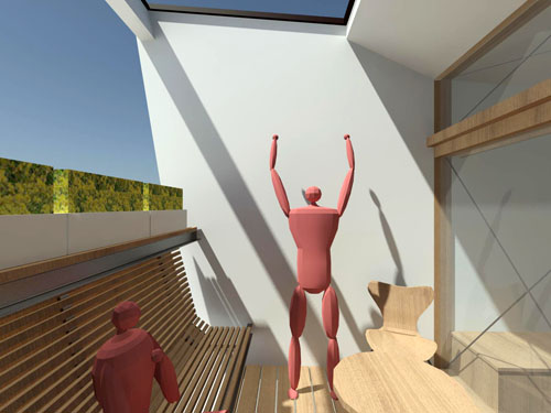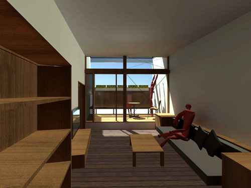 細長い敷地形状をどう活かして生活の場をつくるかが問われます。