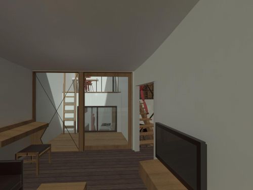 居間と食堂が離れているのを緩和するために中央にテラスを設けスキップフロアを採用した案。