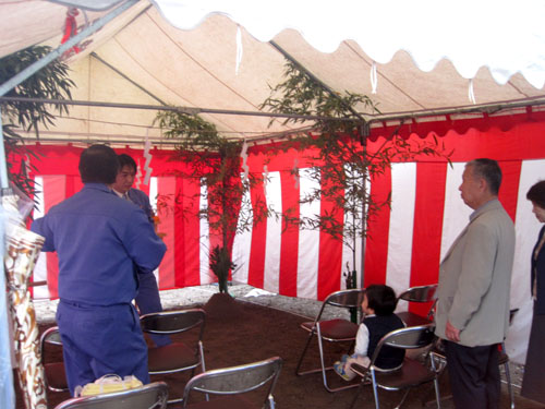 いよいよ工事が始まります。 経験になればと息子二人も同席させましたが、終わった後しきりに「おおおおおおぉぉぉぉぉ」と降神の儀の真似をしておりました。 地縄をみると地鎮祭用のテントより一回り大きいくらい。これがどれくらいの空間に感じるか。楽しみです。