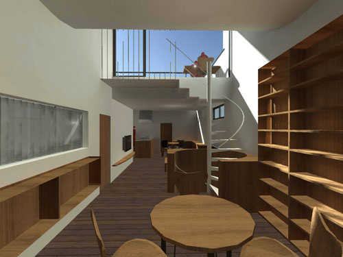 主要な機能を2階に集約した案。 1階の多くがピロティになるため構造とコストに気をつけないと。 また、2階がワンルーム的な空間になるため、空間の抜けのようなものをどうやって確保するかがキモになりそう。