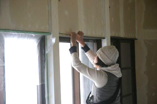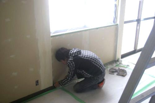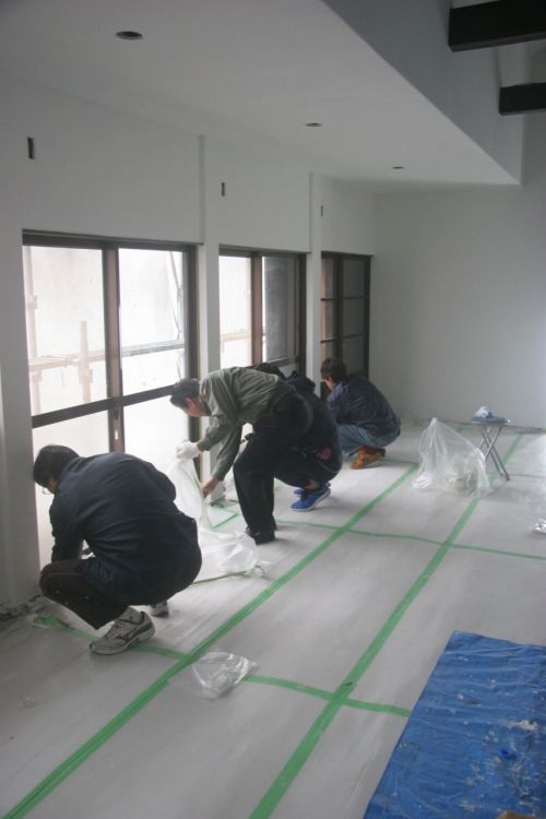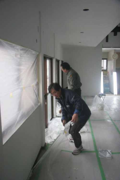 午前中は、大人だけが集まって壁塗り前の養生から。