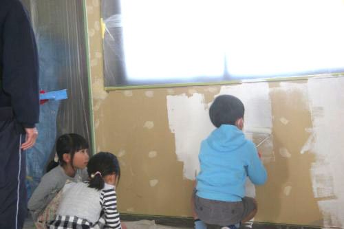 午後からは子どもたちも集まって、壁塗り開始。