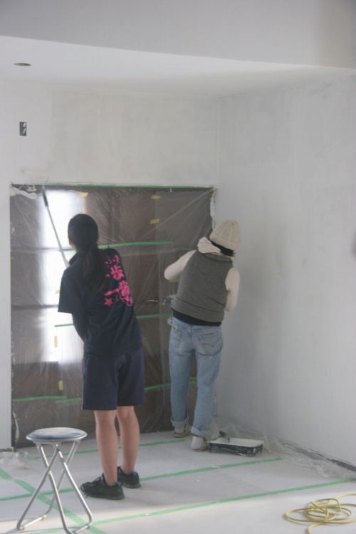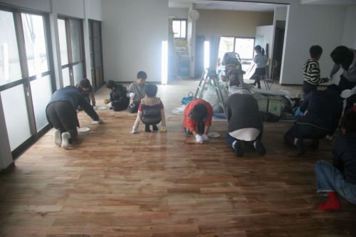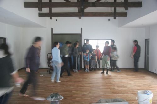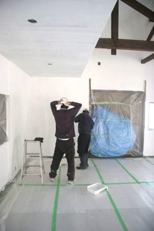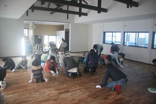2日目も、午前中は大人だけで集まってもらい、壁と床の養生を剥がすところから。