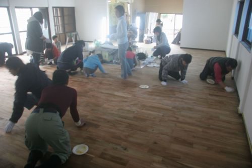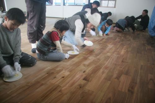 午後からは子どもたちも参戦して、蜜蝋ワックスをスポンジで