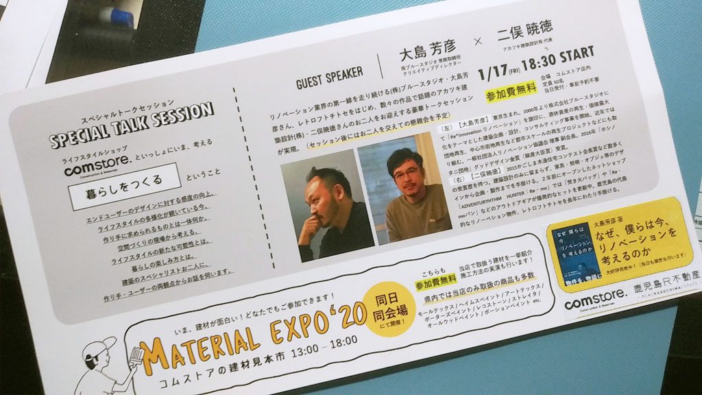 コムストアで「暮らしをつくる」をテーマに、ブルースタジオ大島さんとアカツキ建築設計二俣さんのトークセッションがあったので行ってきました。