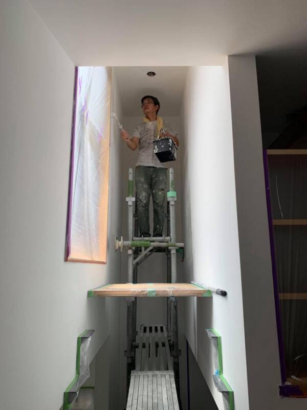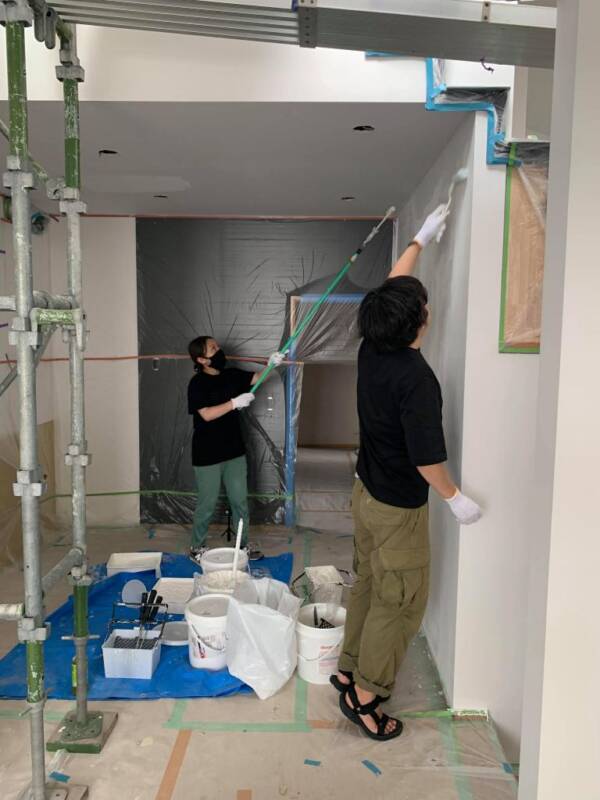 足元の悪い最上階は僕が塗ることにしたのですが、養生で窓を締め切っていたので、熱気が上に登ってきてサウナ状態。すぐに汗だくに。
