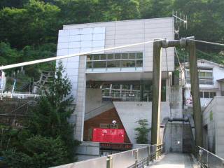 杖立の温泉街にある橋とホールの一体となった建築物である。